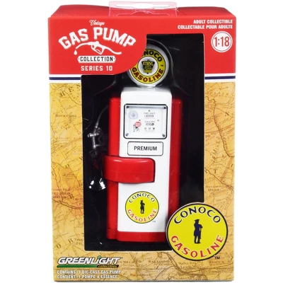Brand new 1/18 scale diecast replica of 1948 Wayne 100-A Gas Pump “Conoco Gasoline” Red and White “Vintage Gas Pumps” Series 10 die cast replica by Greenlight.Limited edition.Brand new box.True-to-scale detail.Officially licensed product.Vintage logos and decoration.Made of diecast with some plastic parts.Dimensions approximately L-1.75, W-1.25, H-3.75 inches.