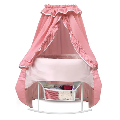 A special place for your precious baby doll to nap or sleep through the night when playtime is done. Sturdy metal frame assembles quickly and rocks smoothly on wide, curved legs. Bright white trim and quilted interior accent the sweet, pink skirting and full, ruffled canopy. Handy storage basket hidden under the skirt for keeping your doll’s accessories organized. Made with metal, fabric, engineered wood, and plastic. No tools required for assembly. For children ages three and up and dolls up to 20 inches. Fabric covering can be hand or machine washed. Metal frame can be wiped clean. Overall size of approximately 21.5 inches L x 12 inches W x 32 inches H. Adult assembly required (no tools needed).