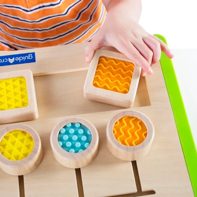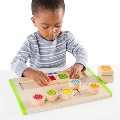 Little hands guide tactile circle pieces across the track to match the patterns of corresponding square blocks with Tactile Matching Maze. The five smooth-sanded circular pieces can be moved around the cutout path while remaining affixed to the sturdy puzzle board. Chunky square puzzle pieces with textured centers can be rearranged to create new patterns for toddlers to follow. With the Tactile Matching Maze toddlers can practice fine motor, problem solving and matching skills. Measures 15″L x 9.5″W x 2″H. Ages 3+.