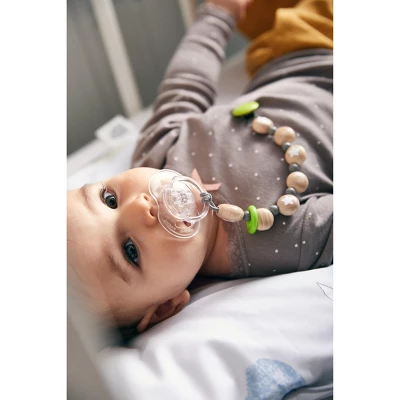 - Star Flight Pacifier chain, features natural colored wood and gender neutral green and grey tones.