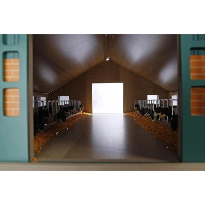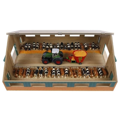 Your young farmer will enjoy this quality Cattle Barn Set in a 1/32 scale size. They can finally enjoy the fun of a Dairy Barn while feeding your herd- all under 1 roof just like on the farm. An easy open hinged roof top allows easy play access from the top as well. Specially made for use in combination with Many 1/32 toys Including ERTL & Universal HobbiesWith windows and sliding doors, opening roof for easy access and two large pens with individual metal feeding rails for livestock.The large sliding doors allow the tractor to go inside to sprinkle the feed neatly at the feed fence with, for example, a feed mixer . The roof of the Barn can be completely closed. To play, simply fold up a portion of the roof and you can easily reach everything.Measures approx. 29″ x 24″ x 10″