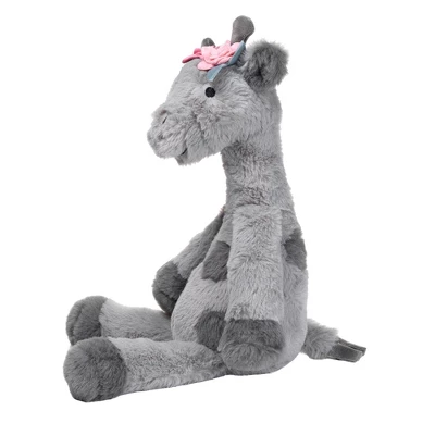 Meet Skylar. She is a super soft and oh so cute plush Giraffe stuffed animal toy. She is made of a light gray luxurious high pile minky with slightly darker spots, feet, and inner ears. Her total body length is 17” and she sits approximately 12” tall. Skylar has 3 sets of 3-dimensional pink flowers on her head that each have 3 layers of petals. Her face is expertly embroidered with no hard pieces, making her baby safe. She will surely be your little one’s favorite plush toy.