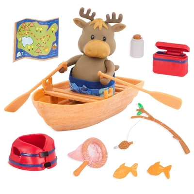 - Includes: This 54-piece set comes with a blue car, camper van, moose family, rowboat, fishing set, storybook, furniture, and more!
