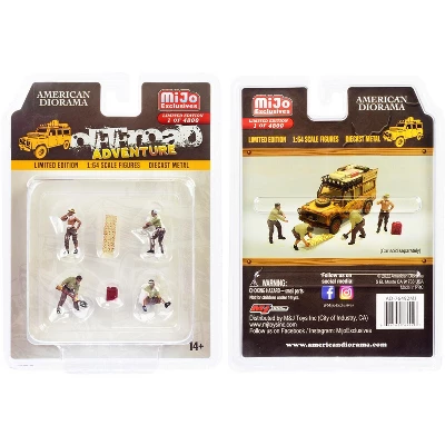 Brand new 1/64 scale diecast models of “Off-Road Adventure” 6 piece Diecast Set (4 Male Figurines and 2 Accessories) Limited Edition to 4800 pieces Worldwide 1/64 scale models by American Diorama.Brand new box.True-to-scale detail.Made of die-cast metal.Comes in a blister pack.Does not come with car shown.Manufacturer’s original unopened packaging.Each figurine is approximately 0.75-1 inches tall.Only 4 figurines and 2 accessories will be received.