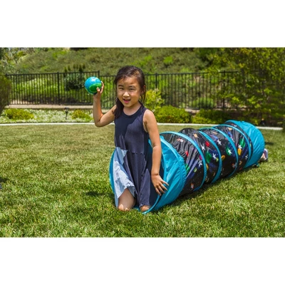 One small step for man, one giant tunnel for your little one! This 6′ tunnel has tons of mesh ventilation and the fun space design makes it perfect for playing in outer space. Connect it’s connector lip to any of our tents for an extreme space station! Wipes clean with a damp cloth, the springs are also covered in padding to protect those little arms and knees. It has fast and easy assembly and folds back up quickly for storage and travel in it’s own carrying case. Blastoff!