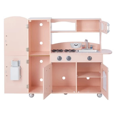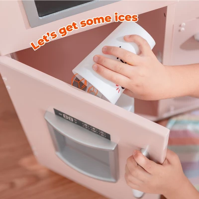 Your little chef will love cooking in the Pink Retro and Contemperary Kitchen. Kids ages three and up love to pretend using the refrigerator. microwave. stove. oven. and sink. The kitchen’s durable design and moving parts will keep your child entertained. The kitchen also stands up to rough play.