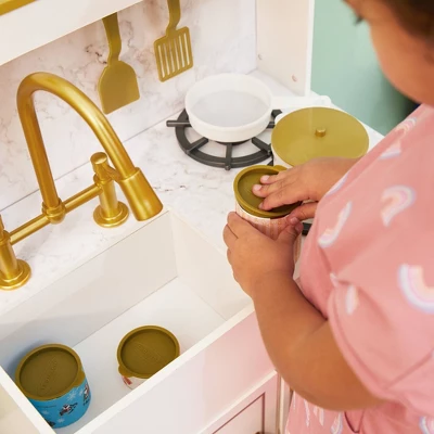 Teamson Kids’ Petite Versailles Play Kitchen gives your little chef a realistic cooking experience. The white finish, gold hardware and gray marble backsplash add a sophisticated style to this classic kitchen set. Interactive details include turning and clicking knobs, analog clock with movable hands and turning faucet levers. The deep farmhouse style sink with gold gooseneck faucet and turning levers provides a space to wash vegetables or clean the dishes. The hooks on the marble backsplash, top shelf and underneath cabinet all provide storage space for cookware and pretend food. Eleven accessories include a phone, pots and pans, spatulas, seasoning and pretend cans of food. The Petite Versailles Classic Play Kitchen measures 19.75″ long, 18.25″ deep, and 35.5″ tall and is recommended for ages 3 years and up.Â